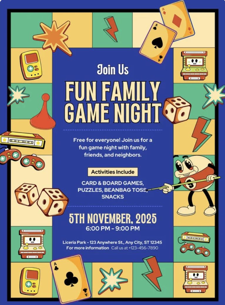 game night flyer May 29 Written By Esha J We are so excited to announce our first Meals with Meaning event, where we will be hosting many games for seniors to play with our volunteers as we also share a meal! Looking forward to meeting everyone soon! Esha J